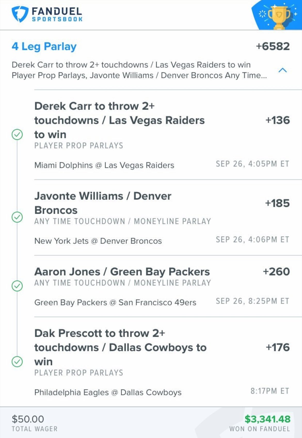 Fanduel Sportsbook On Twitter 50 3 341 48 Dak And The Cowboys Capped Off This Smooth 4 Leg Nfl Parlay Last Night Makeeverymomentmore Https T Co Yvvfymr2xd Twitter